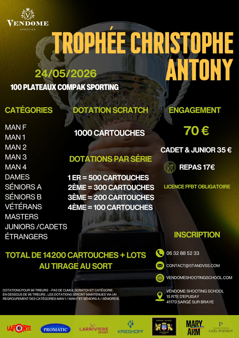 Le club VENDOME SHOOTING souhaite développer plus encore l'activité sportive du ball-trap. Chaque année des tireurs s'engagent en compétitions locales, nationales et internationales. Dans le cadre de la promotion du stand et de l'encouragement envers les tireurs à s'inscrire nous dotons ceux qui ont honoré nos couleurs en montant sur une marche du podium.