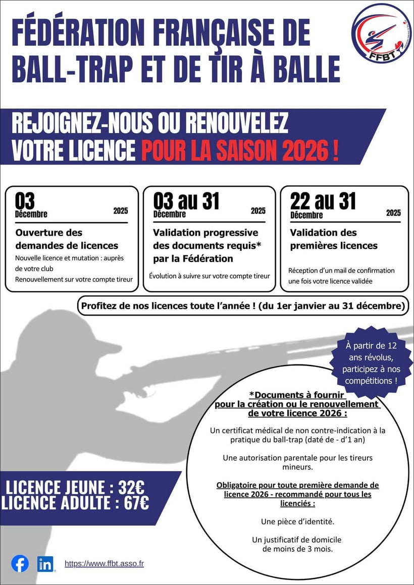 Rendez-vous à cette page pour le tarif et la procédure d'obtention selon votre statut tireur, licencié au club, en mutation de licence ou première licence.